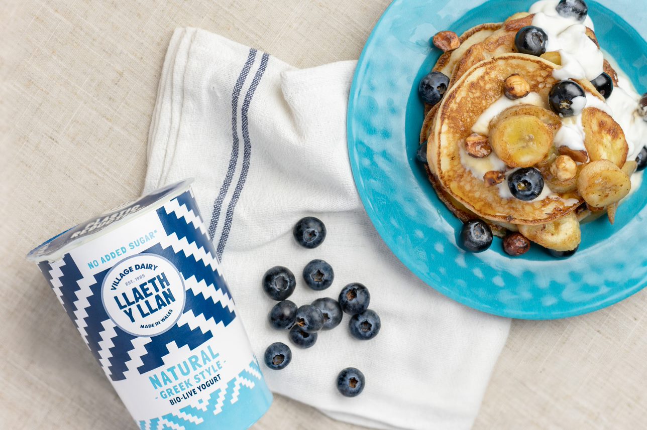 - Toddwch 25g o'r menyn mewn sosban fach. Torrwch y blawd i mewn i fowlen a'i droi mewn hanner y siwgr. Gwnewch ffynnon yn y canol ac ychwanegwch yr wy, menyn toddi a fanila. Cymysgwch iogwrt a dŵr di-fraster naturiol Llaeth y Llan gyda'i gilydd a'i guro'n raddol i'r gymysgedd nes ei fod yn llyfn.